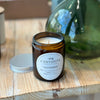 Die 150g Kerze kommt in einem bernsteinfarbenen Glas mit Aluminiumdeckel.