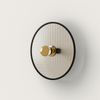 Schöne Wandleuchte 'Lass' von Aromas del Campo. Runder goldfarbener Teller aus Glas mit schwarz gefasstem Rand.